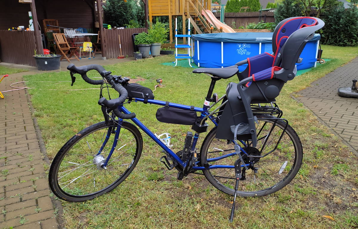 Gelegentlich fahre ich das Rad jedoch auch mal mit einem Kindersitz. Unser alter Römer Jockey ist dafür genau richtig.
