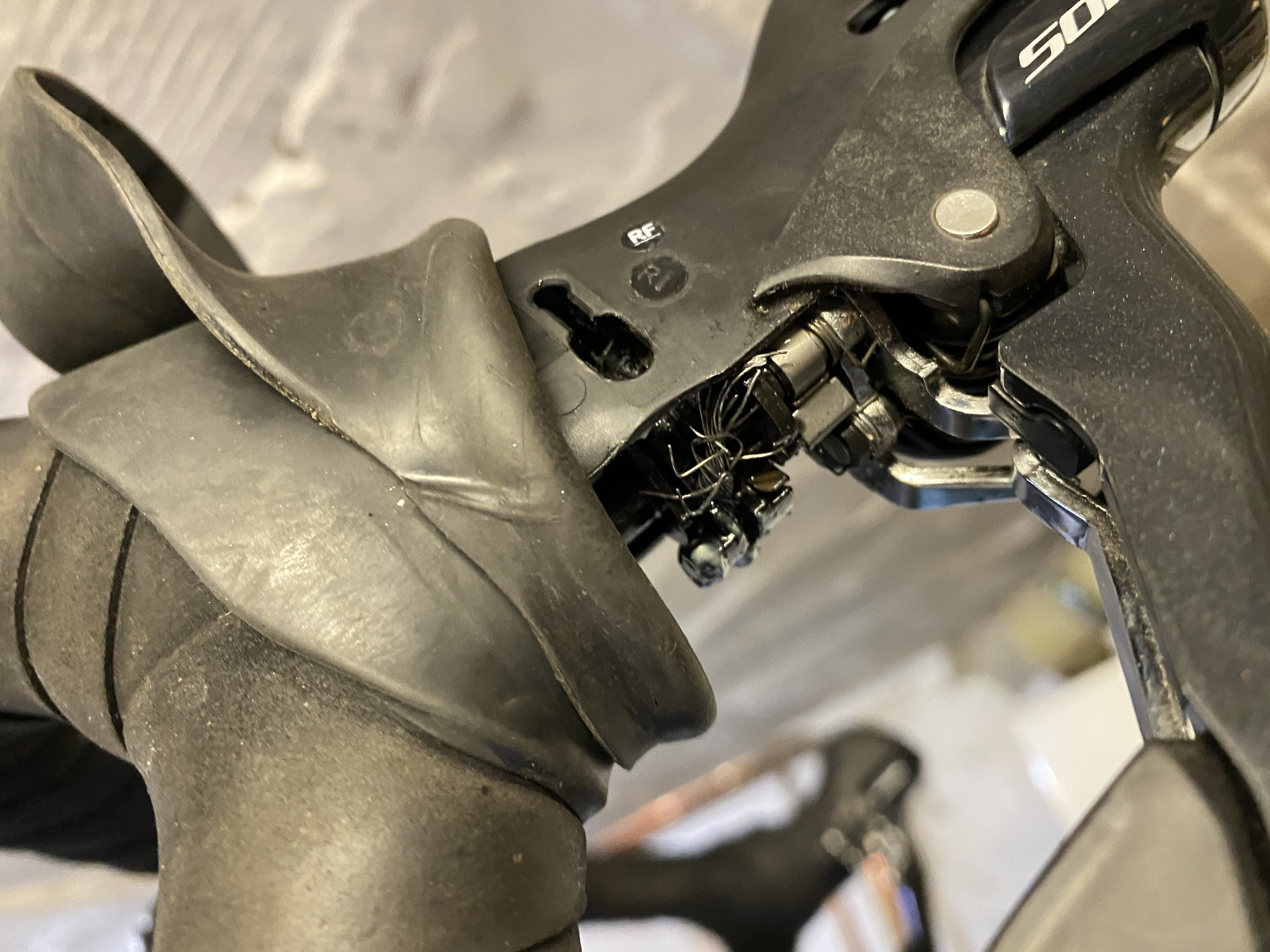 Dann ist im Januar 2021 (an einem sehr sehr kalten Tag) der Schaltzug meines 9-Fach STIs gerissen. Ich kann mir den Riss nicht wirklich erklären. Jedenfalls war der Riss direkt im Schaltgriff-Gehäuse und der Zug war danach ziemlich verkantet im Schaltgriff. Ich konnte diesen nur mit Mühe entfernen. Danach war der Schaltgriff leider hinüber. Ob dies meine Versuche waren den gerissenen Zug zu entfernen oder ob der Defekt bereits bestand konnte ich nicht klären.