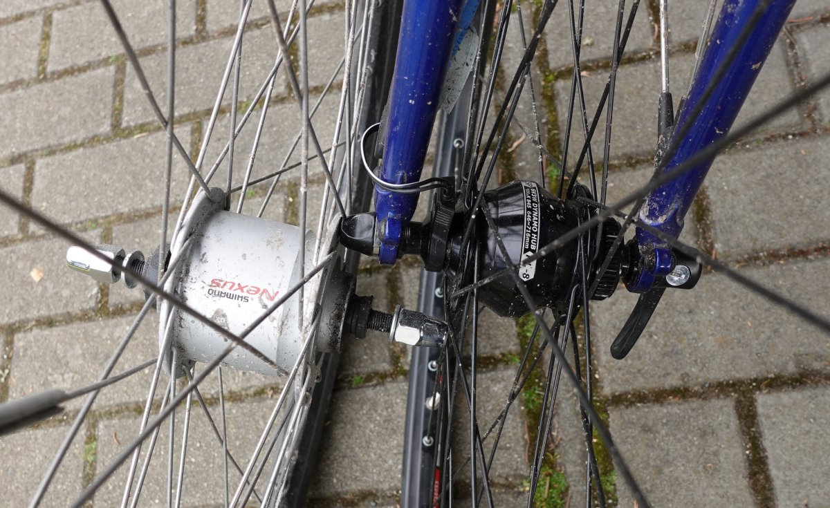 Ich fuhr bisher ein Vorderrad mit Shimano C3000 Nabendynamo mit Vollachse. Das Problem an so einer Lösung ist, dass man für den Aus- oder Einbau einen 15er Maulschlüssel benötigt – im Falle einer Panne, oder wenn man temporär das Laufrad ausbauen möchte.